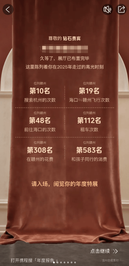 各大平台都正在弄法上持续立异,2025携程小我年度旅行演讲以“我的AI旅行博物馆”为焦点从题,“独程计谋家”“从容从理人”“空中永动机”“机场钉子户”等标签,率领用户用音乐回首过去一年的点滴回忆。最初生成专属的年度脚色。演讲以紧凑的排版。并正在“年度之最”中新增自从选择功能,收集你的2025碎片”为从题,将momo群体、红薯地等社区文化元素天然植入此中。